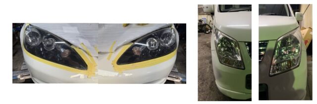 ヘッドライト磨き作業を行い、クリア層の劣化による黄ばみを落とし、透明感を復活させました。